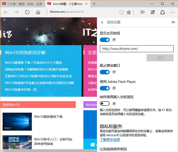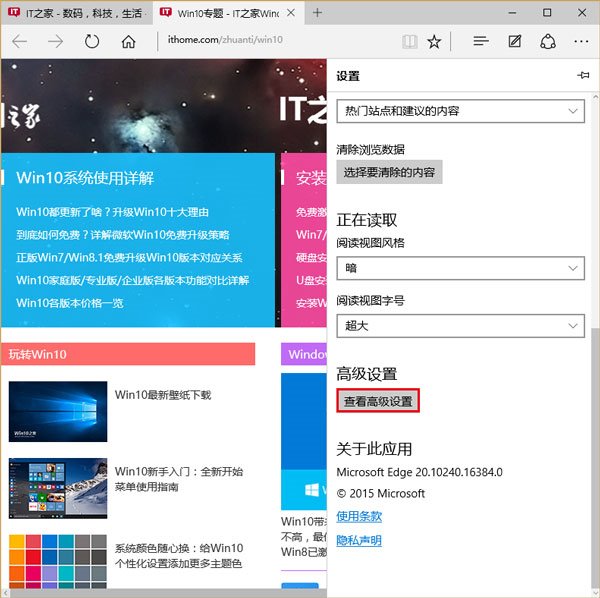 主頁的設定需要在“高級設置”中進行,稍顯麻煩,但也很簡單。習慣使用“主頁”功能的用戶可以在Edge瀏覽器設置中,在下方找到“查看高級設置”,點擊進入。