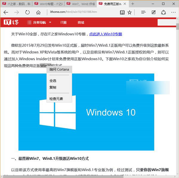 如果你在瀏覽網頁時遇到了不懂的地方,可以在選中相應文字后,點擊鼠標右鍵選擇“詢問Cortana”。此時Win10數字助手Cortana小娜就會為你解答。
