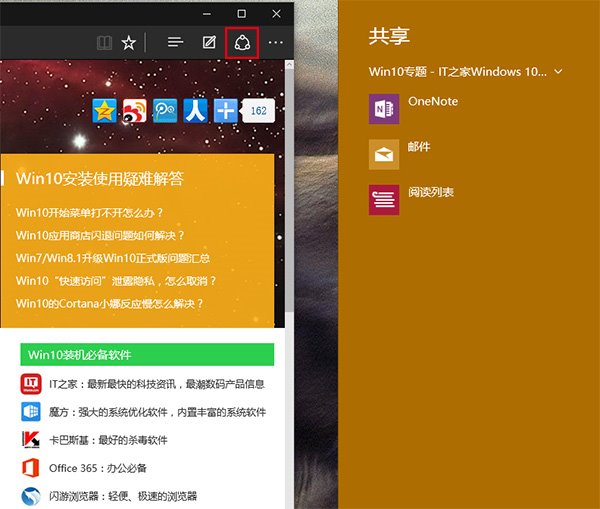 ▲“共享”有三種方式:OneNote、郵件、閱讀列表