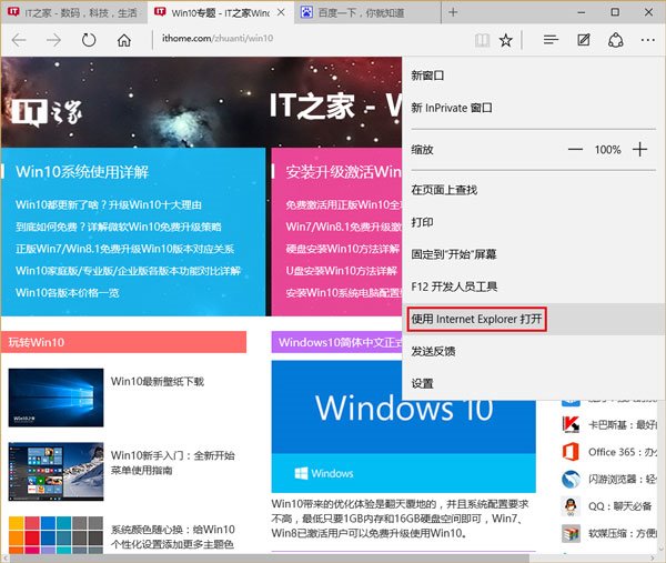在文章開頭,我們曾經強調過Edge瀏覽器的兼容性還不能和IE11相比,因此在遇到某些特殊網頁時,還需要靠萬能的IE瀏覽器“拔刀相助”。微軟也在Edge瀏覽器的“…”菜單中放置了“使用Internet Explorer打開”的選項,點擊后自動打開IE,并且跳轉到請求頁面。