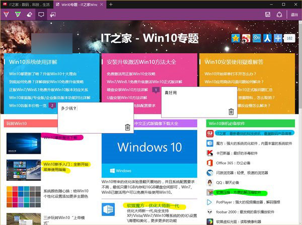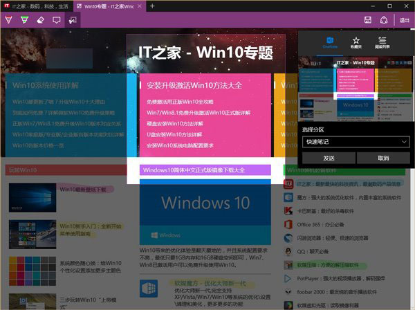 這項功能可以讓你在網頁上隨意寫寫畫畫,把關鍵內容用手寫的方式標記出來保存并分享給好友,特別適合平板電腦等觸摸屏設備用戶(鼠標拖動也可以實現手寫效果)。點擊Edge瀏覽器右上方第二個“手寫”圖標就可以開啟該模式。
