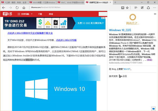 小娜在給出答案時并不會直接打開一個網頁來告訴你,而是采用Edge瀏覽器常見的右邊欄方式給出內容提要,如果你想具體深入的了解,可以點擊該內容的藍色標題進入相關頁面查看詳情;也可以通過必應搜索剛才選中的關鍵詞來查詢內容。