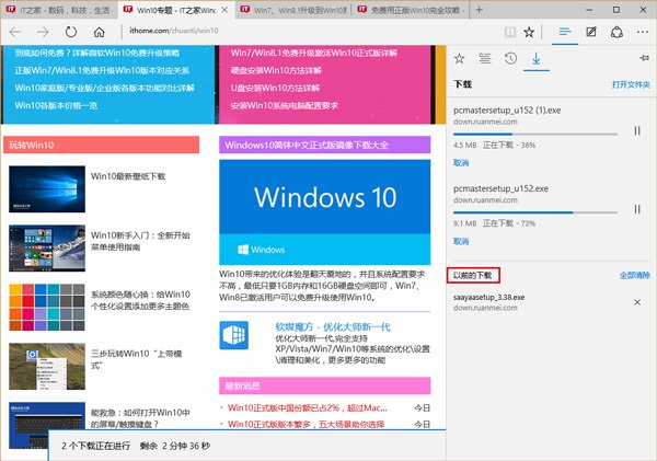 Edge瀏覽器中的下載器功能較為簡單,看起來和IE11有些類似。點擊一個可下載的鏈接后,會在瀏覽器底部出現一個提示信息,包含下載數量和剩余時間。
