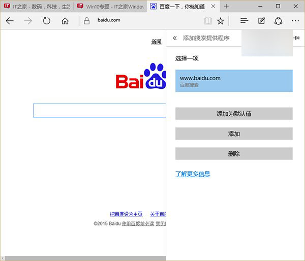 ▲必須要首先打開要添加的搜索引擎頁面后,才可以執行“新增”操作。如果此時選擇“添加為默認值”可以直接修改默認引擎