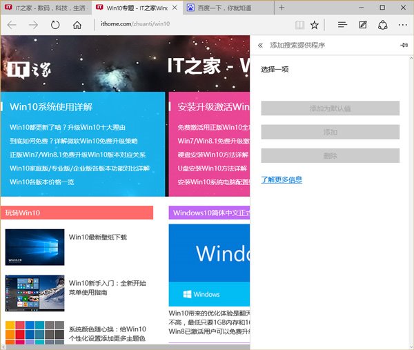 Edge瀏覽器地址欄默認只支持必應搜索,添加其他搜索引擎相對麻煩一些,需要先打開該引擎頁面才能進行添加。