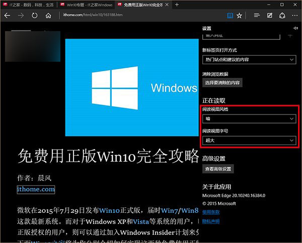▲在Edge瀏覽器設置中,可以調節閱讀視圖背景色(閱讀視圖風格)和字號