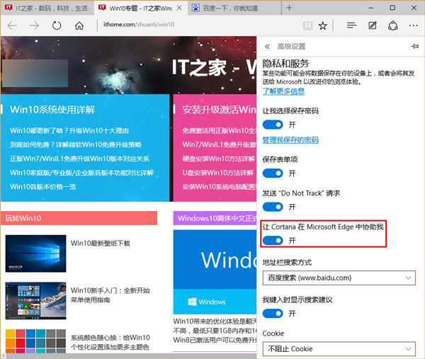▲Cortana設定要在Edge瀏覽器的“高級設置”中進行