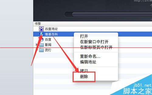 7、然而,書簽欄中的書簽列表里面,就有,就會顯示我們以前收藏過的書簽了,有些事系統默認給你收藏的書簽。可以在對應的網站上點擊鼠標右鍵--->刪除。來刪掉不要的收藏網址。
