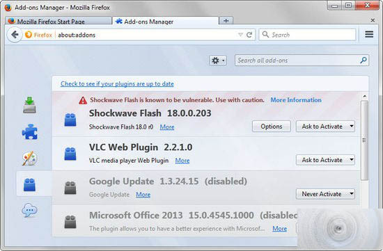 Adobe Flash所存在的安全漏洞讓其所有版本在Windows、Linux和Macintosh系統上運行時都受到影響。Firefox在其插件管理頁面發布了一個有關Flash存在安全漏洞的警告信息(如下圖),Shockwave Flash被設置成“要求激活”和“永久允許”狀態選擇。