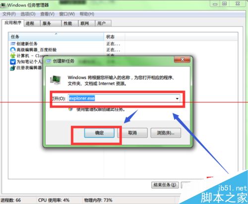 4、回到應用程序頁簽,新建任務,彈出窗口輸入explorer.exe,點確定保存。