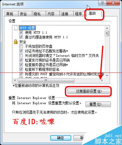 3、找到internet選項(xiàng)對話框,找到【高級】 選擇【還原高級設(shè)置】如圖