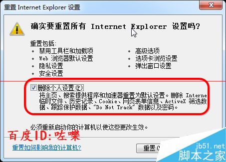 4、重置internet explore設(shè)置,注意要勾選【刪除個人設(shè)置】