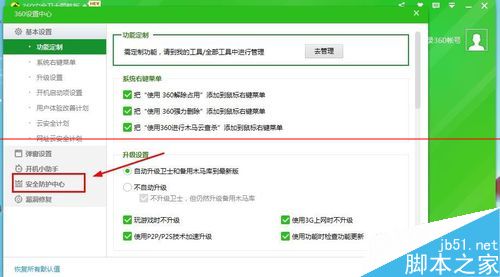 3、點擊設置以后會彈出一個新的窗口,如圖所示。在左側的菜單欄中找到安全防護中心
