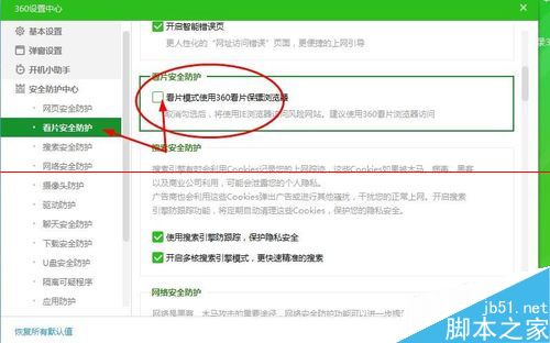 5、點擊安全防護模式以后再右面會彈出一個新的窗口,有個選項,看片模式使用360看片保鏢瀏覽器