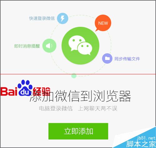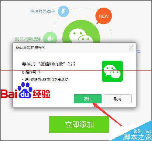 2、如果用微信的話,也可以直接點擊下面的立即添加。接著它會彈出一個確認新增擴展程序的面板。如果你要是想添加的話,就直接點擊添加。