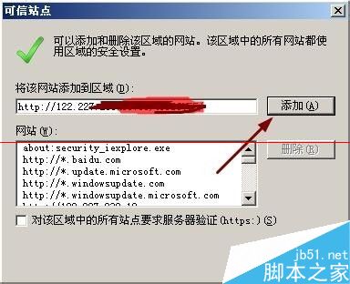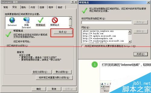3、點擊“站點”按鈕,彈出可信站點窗口