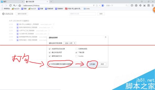 4、點擊清除歷史記錄按鈕,進入對話框。在關閉瀏覽器前自動清除瀏覽記錄前打鉤。然后點擊立即清除。