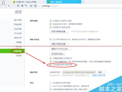 3、在【選項】界面下,點擊選擇【高級設置】--勾選【自動停用來源不明的擴展】選項完成設置。(如圖所示)