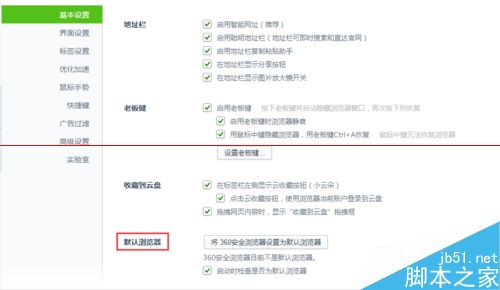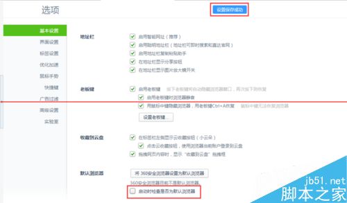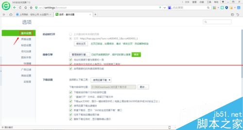 4、在左側(cè)菜單欄【基本設(shè)置】選項(xiàng)里,下翻界面,在默認(rèn)瀏覽器選項(xiàng)下可以看到勾選了啟動(dòng)時(shí)檢測(cè)是否為默認(rèn)瀏覽器,這也是為什么每次登陸瀏覽器都會(huì)提示的原因了,如下圖所示。