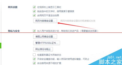 3、在”網(wǎng)頁設(shè)置選項(xiàng)下“點(diǎn)擊【網(wǎng)頁內(nèi)容高級(jí)設(shè)置】