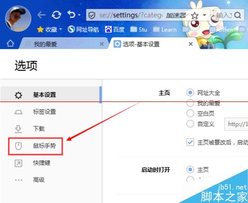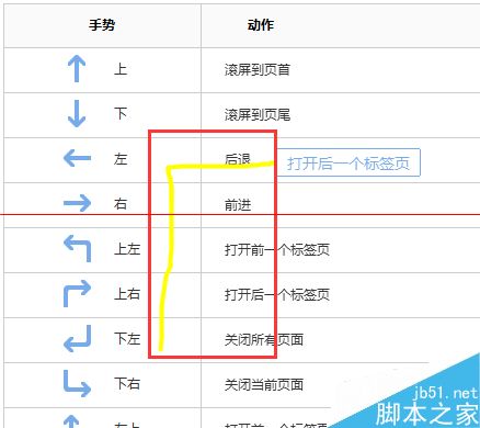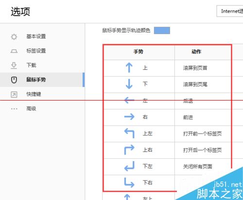 6、設置【手勢】,瀏覽器已經(jīng)默認設置了很多手勢了,大家可以根據(jù)個人習慣更改哦