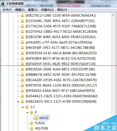 3、打開注冊表定位到【HKEY_CLASSES_ROOT/TypeLib/{EAB22AC0-30C1-11CF-A7EB-0000C05BAE0B}/1.1/0/win32】項(xiàng)下