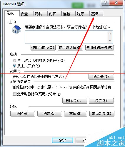 2、進(jìn)入Internet屬性對話框,點(diǎn)擊上方【高級】選項(xiàng)