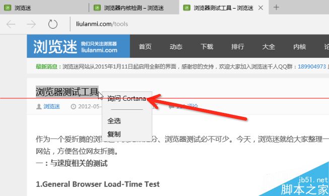 其他方面,由于Win10添加了全新的語音助手小娜,因此在Spartan瀏覽器的右鍵菜單中,出現了向小娜詢問的功能,如下圖所示。