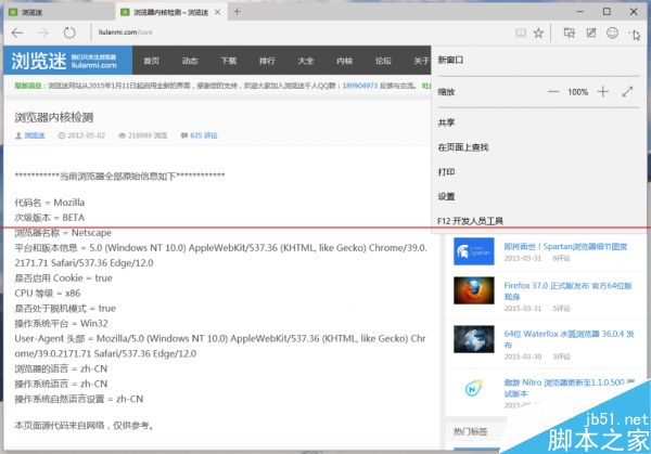 用Spartan 斯巴達瀏覽器訪問瀏覽迷內核及UA檢測界面的結果,由上圖可以看到,現階段Spartan 斯巴達瀏覽器的UA信息為: