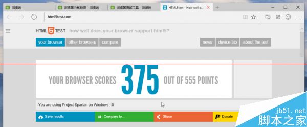 目前階段,Spartan 斯巴達瀏覽器的 HTML5 測試得分為375分,Acid3的測試得分為100分。