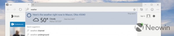 此外Cortana還提供實時查詢,例如當(dāng)你想要知道外面的天氣,你只需要在地址欄上輸入“Weather”關(guān)鍵詞,在無需跳轉(zhuǎn)到搜索結(jié)果頁面就能獲得當(dāng)前用戶所在位置的天氣信息。