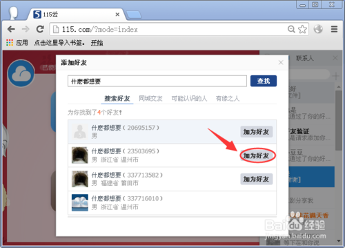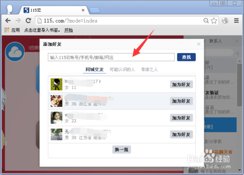 3、按一下顯示窗口上“添加好友”,輸入你想要添加好友的115網(wǎng)盤賬號或者昵稱等進(jìn)行查找好友。