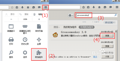 首先需要在計算機上安裝火狐瀏覽器(如果希望快速安裝可以下載火狐瀏覽器離線安裝包進行安裝),安裝完成后啟動火狐瀏覽器,在火狐瀏覽器右上角處單擊“菜單”按鈕,在打開的下拉菜單中選擇“附件組件”,在打開的附件組件頁面的搜索框中輸入“greasemonkey”(該插件也稱為油猴子),在搜索結果中選擇greasemonkey3.0單擊“安裝”;