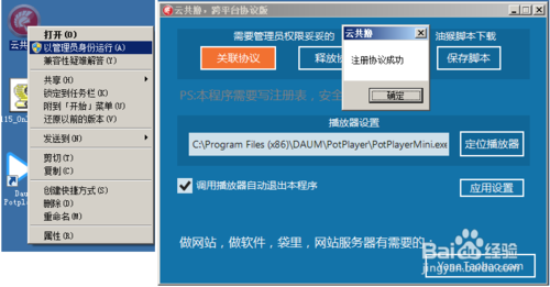右鍵“云共擼”選擇“以管理員身份運行”,在打開的云共擼窗口,勾選“調用播放器自動退出本程序”,單擊“定位播放器”將上步驟中復制的鏈接地址粘貼,完成上述步驟后單擊“關聯協議”;