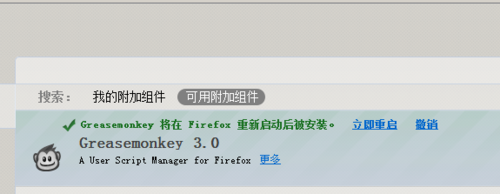 安裝完成后單擊瀏覽器中“greasemonkey將在Firefox重新啟動后被安裝”提示重新啟動瀏覽器;