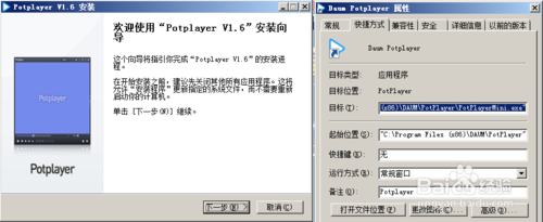下載后安裝potplayer,安裝完成后,右鍵桌面potplayer圖標,選擇“屬性“,在打開的屬性對話框中切換到“快捷方式”選項卡下,復制“目標”對話框后的鏈接地址(下一步驟中使用);