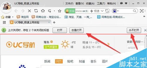1、筆者記得有一次淘寶瀏覽器彈出提示,詢問(wèn)是否打開(kāi)上次未關(guān)閉的標(biāo)簽,點(diǎn)擊了“總是打開(kāi)”按鈕后,才導(dǎo)致淘寶瀏覽器打開(kāi)后顯示上次未關(guān)閉的標(biāo)簽,如果點(diǎn)擊“永不打開(kāi)”按鈕的話,就不會(huì)這種情況了。