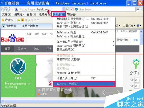 2,進入IE界面后,找到菜單欄中的“工具”,打開工具菜單,然后在菜單中選擇“Internet 選項”。
