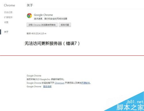 8、如果顯示“無法訪問更新服務器(錯誤4)”,錯誤 4 表示無法解決問題,建議向Chrome論壇反饋,或者直接卸載Chrome,然后直接安裝最新版。