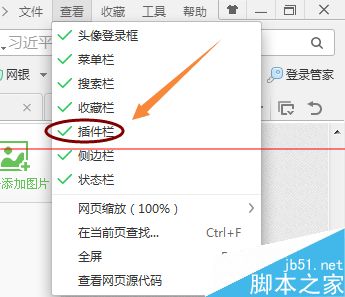 1、打開360瀏覽器以后,我們點擊右上角的“查看”,然后將查看下的“插件欄”前面打鉤選中