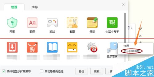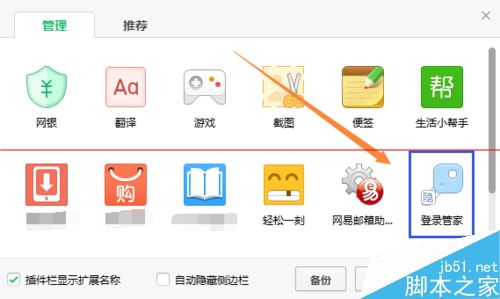 3、之后就會在彈出的窗口下看到所有我們安裝過的小插件,有一些是系統(tǒng)自帶的;我們點擊“登錄管家”,然后將其“顯示到插件欄”