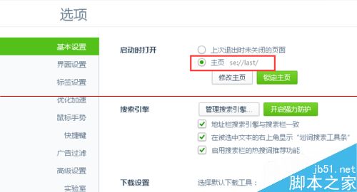 4、在選項(xiàng)界面中的基本設(shè)置模塊,我們可以看到360瀏覽器啟動(dòng)時(shí)打開默認(rèn)的頁面是主頁