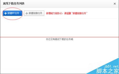 如果有種子,在彈出的窗口點擊“新建bt任務”(如果是鏈接,可以點擊旁邊的新建鏈接任務,接著黏貼鏈接,然后跳到4)。