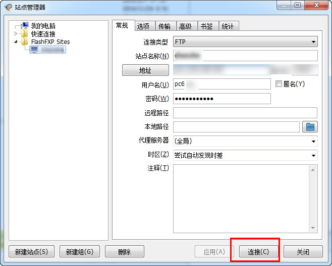 4、設置連接參數,類型FTP,地址填FTP服務器的地址(本地),端口不要改。用戶名和密碼可以從管理員獲得,允許匿名登錄的話就把“匿名”勾上。如果有遠程的地址也可以填上,填完之后點擊“連接”