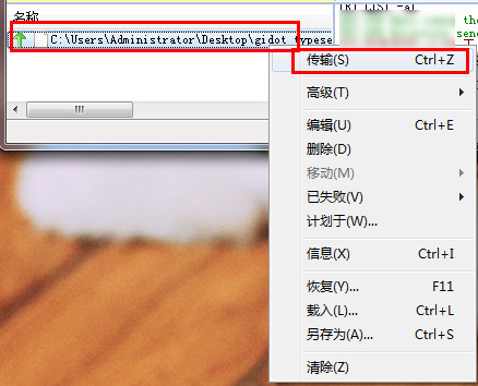 6、在FlashFXP上傳列表內(nèi),單擊鼠標(biāo)右鍵,選擇“傳輸”,或按住ctrl+z進(jìn)行上傳。