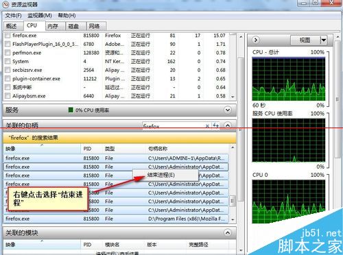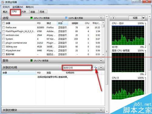 6、在“資源監視器”窗口中選中“CUP”選項卡在“搜索句柄”文本框中輸入“firefox”點擊后面的搜索按鈕。