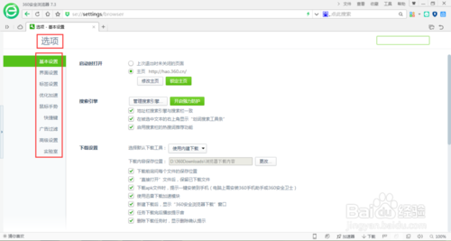 3、點擊下拉菜單里的【選項】功能,進入360瀏覽器選項界面,如下圖所示。
