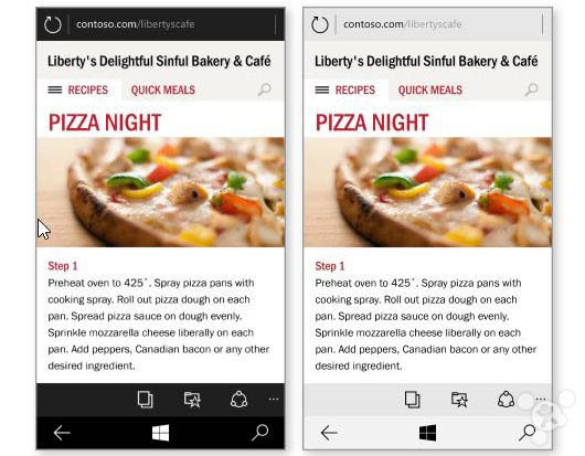 從微軟公布的 PC 端和手機端的截圖來看,不同 Windows 10 設(shè)備之間的 Spartan 瀏覽器外觀十分相似,尤其是屏幕頂部的標(biāo)簽欄,就算在智能手機上也能通過小按鈕輕松切換標(biāo)簽。 移動版上目前已經(jīng)確定有幾個關(guān)鍵的按鈕實現(xiàn)對應(yīng)功能,比如共享按鍵、添加網(wǎng)頁到收藏夾的按鍵、刷新頁面等。
