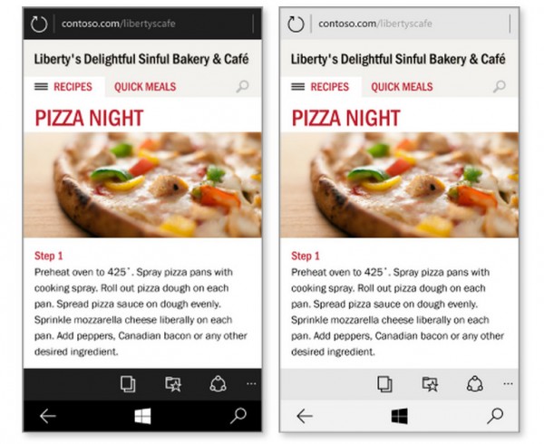 微軟表示在Windows 10系統中將會默認使用這全新的瀏覽引擎,你可以認為這些是專門為Modern網站而重新設計的東西。如果你還對這款瀏覽器在移動端的內容感興趣,今天微軟還分享了兩張黑暗和白天主題的截圖。