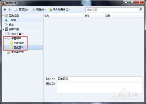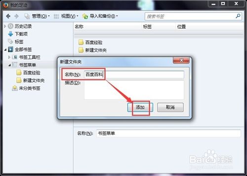 5、選中【書(shū)簽菜單】,點(diǎn)擊右鍵,右鍵菜單點(diǎn)【新建文件夾】,修改【名稱】后,點(diǎn)擊【添加】,這里添加了兩個(gè)文件夾即兩個(gè)書(shū)簽分類,如圖所示: